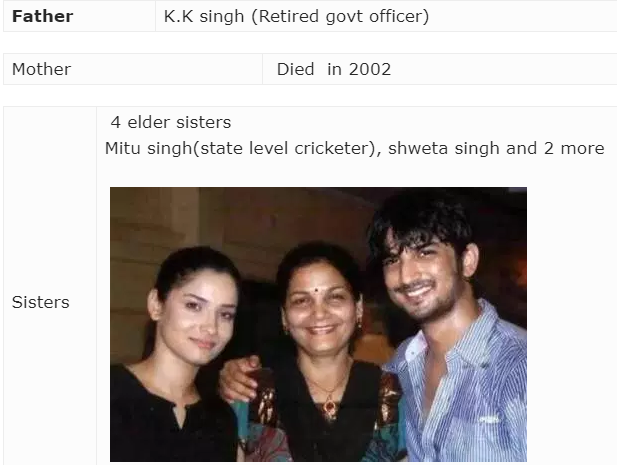 Sushant Singh Rajput was born in Patna. His ancestral village is Maldhiha in Bihar’s Purnea district . One of his sisters, Ritu Singh, is a state-level cricketer. His mother’s death in 2002 left Rajput devastated and it was in the same year that the family moved from Patna to Delhi. One of his sisters, Ritu Singh, is a state-level cricketer.[16][2] His mother’s death in 2002[17]left Rajput devastated and it was in the same year that the family moved from Patna to Delhi.